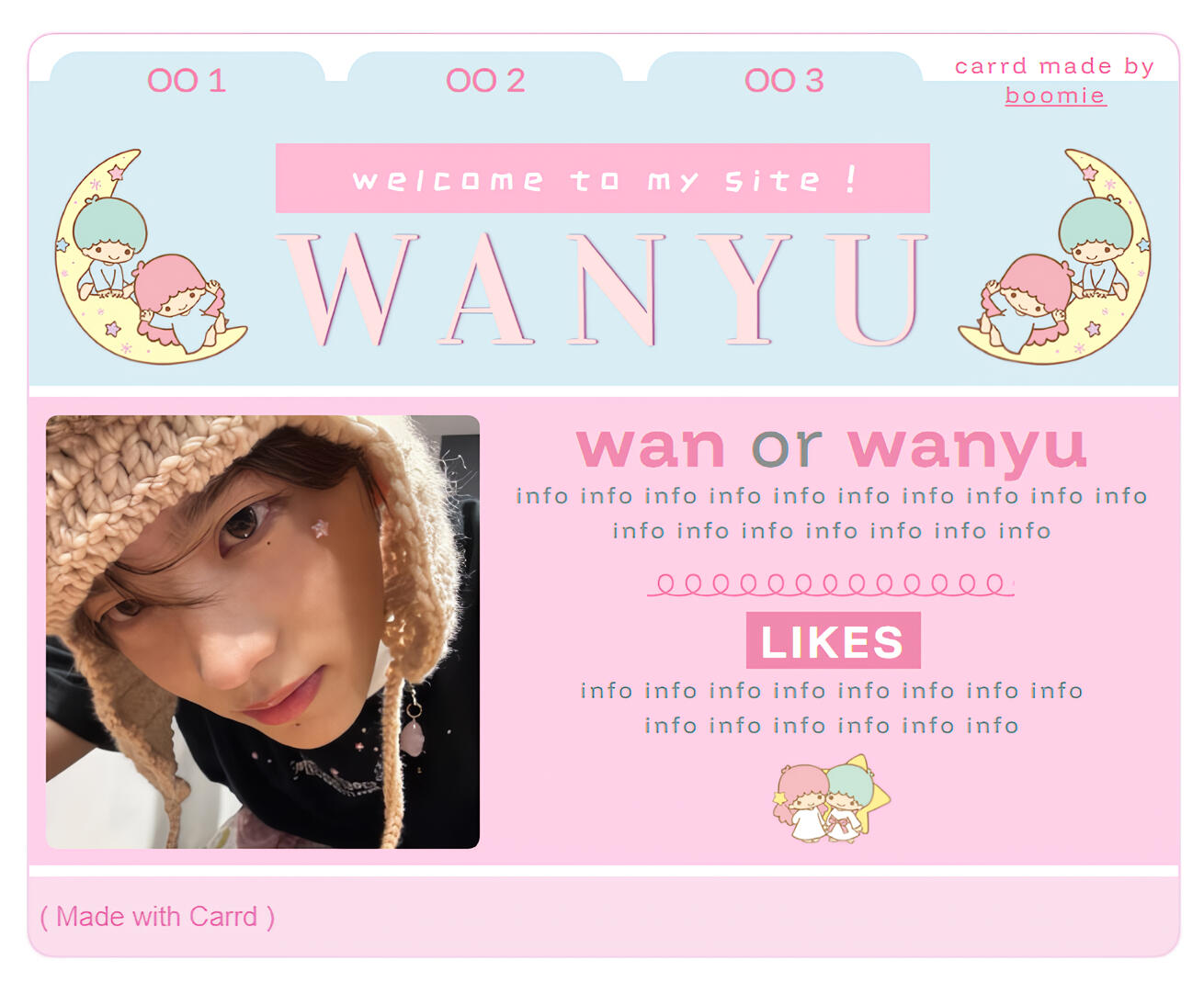 hello ! you can call me boomie, i make carrds, and set up discord servers.more detailed info of my commissions on another page, just click the button right below this message > <